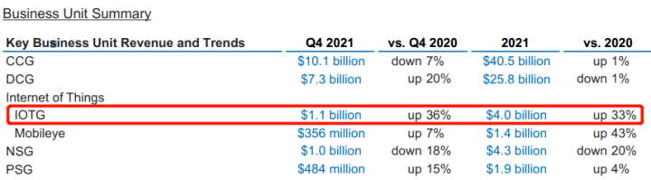 在晶圓代工巨頭臺積電公布的財報中,2021年其手機業(yè)務(wù)營收首次被HPC(大型高性能計算)業(yè)務(wù)超越,面向汽車板塊的營收和訂單需求也猛增。 圖像傳感器芯片設(shè)計龍頭韋爾股份最新財報顯示,其半導(dǎo)體業(yè)務(wù)收入同比增長18%,雖然智能手機CMOS占據(jù)營收大頭,但業(yè)績增長主要來源于車載CIS與安防CIS,尤其在安防領(lǐng)域?qū)崿F(xiàn)高達60%的業(yè)績增長。 2021年物聯(lián)網(wǎng)事業(yè)部(IoTG)成為國際半導(dǎo)體巨頭英特爾增長最快的業(yè)務(wù),同比增長33%,同時汽車自動駕駛業(yè)務(wù)也增速驚人,反觀主營PC終端的CCG部門業(yè)績僅增1個百分點。