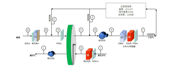 2)低濕需求空調(diào)房間,如正極輥壓間、正極分條間、正極模切間以及正極二分間等房間,其濕度控制需求為≤20%,以及正極涂布間、負(fù)極輥壓間、負(fù)極分條間、負(fù)極模切間以及負(fù)極二分間等房間,其濕度控制需求為≤45%,該需求通過冷卻除濕很難實現(xiàn),因此往往通過轉(zhuǎn)輪除濕機(jī)組處理后來滿足使用需求,機(jī)組中設(shè)置一級轉(zhuǎn)輪。