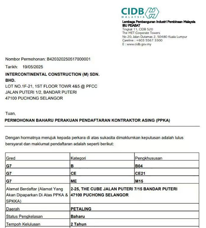 近日,經(jīng)馬來西亞建筑工業(yè)發(fā)展局(CIDB)批準,合景建設集團有限公司全資子公司洲際建設(馬來西亞)有限公司取得馬來西亞最高等級G7承包商資質(zhì),包括土木工程(CE21)、土建工程(B04)、機電工程(M15)以及各種機械工程等多項內(nèi)容。這是合景建設在馬來西亞建筑資質(zhì)領域的重大突破,意味著公司在智慧建筑領域的技術實力、屬地化服務能力及行業(yè)影響力獲官方權威認可。