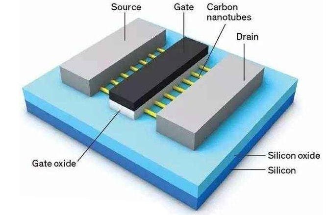 在CNFET中,源極和漏極之間的溝道由碳納米管組成,其直徑僅有1–3 nm, 意味著其作為晶體管的溝道更容易被柵控制。因此, 碳納米管晶體管比傳統(tǒng)硅基晶體管在比例縮減上的潛力會(huì)更大。