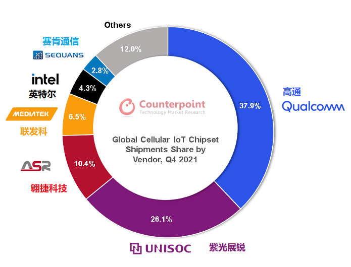 幾乎所有物聯網終端都需搭載IoT通信芯片,因而通信射頻芯片能夠直觀反映物聯網行業(yè)的成長周期與終端需求,堪稱行業(yè)風向標。在Counterpoint發(fā)布的全球蜂窩物聯網芯片追蹤報告中,高通、紫光展銳、翱捷科技、聯發(fā)科、英特爾、Sequans、華為海思等占據了大部分市場份額。