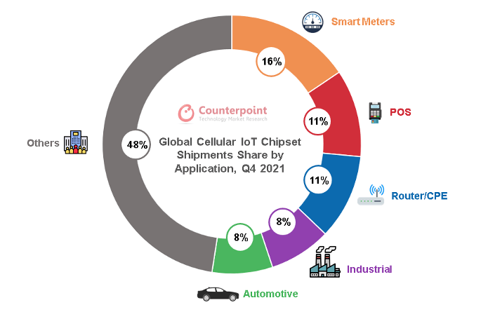 在蜂窩物聯網芯片中,當前應用規(guī)模最大的是低速率的NB-IoT芯片(占比60%),NB-IoT也是我國主推的物聯網連接方式,應用在智能儀器表盤、資產追蹤等場景。其次是中速率的2G/3G(占比30%),用于移動支付、智能穿戴和智能家居中。4G Cat.1和5G大約占比10%, 5G模組的成本過高,加上大部分物聯網終端對傳輸速率的需求性不高,5G在物聯網終端的應用占比較低,主要是自動駕駛和視頻監(jiān)控領域,但隨著2G/3G轉網,Cat.1在智能支付、定位追蹤、車載終端、視頻監(jiān)控領域的高速增長,正逐漸打破蜂窩物聯網6:3:1的格局。從應用場景來看,智能表計、POS支付、路由器/CPE、工業(yè)、汽車是蜂窩物聯網芯片應用最廣泛的前五大場景。